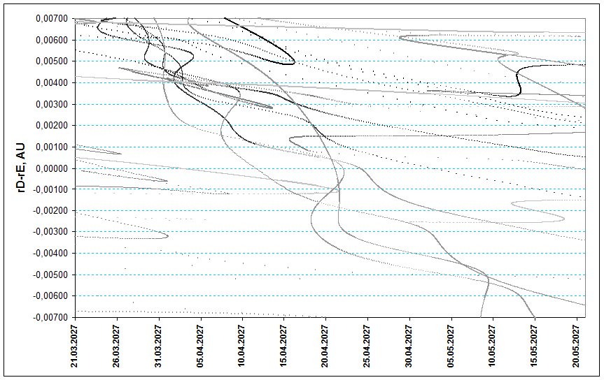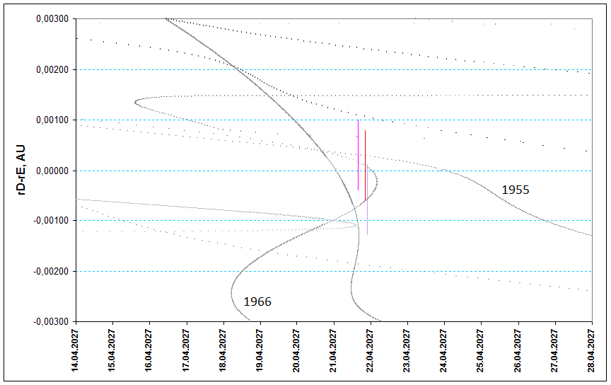 P/2009 WX51-ids: prediction of activity to the list of predictions ![]() Fig. 1. Space-temporal projection of the P/2009 WX51-ids trails parts onto their minimal distance passages in 2027 (correspondence between colours of the particles and their ejection velocities can be seen here). ![]() Fig. 2. Detailed space-temporal projection of the P/2009 WX51-ids trails parts onto their minimal distance passages in 2027 (correspondence between colours of the particles and their ejection velocities can be seen here). ![]() Fig. 3. Even more detailed space-temporal projection of the P/2009 WX51-ids trails parts onto their minimal distance passages in 2027 with marked moments of maxima from 1955 and 1966 trails (correspondence between colours of the particles and their ejection velocities can be seen here). The comet P/2009 WX51 (Catalina) was discovered in 2009 as a very faint object having near-Earth orbit with the MOID of 0.0094 AU from the Earth's orbit in that year. Its cometary activity was very low, almost absent. In the subsequent perihelia of 2015 and 2020 the comet was not recovered while the perihelion of 2026 was still in the future at the time of this survey preparation. This object despite its faintness deserves interest because of its quite sustainable near-Earth orbit with the MOID smaller than 0.02 AU from the perihelion of 1988 and finishing the future periheion of 2042. So far even in spite of current low level of cometary activity and therefore low amount of ejected meteor dust this comet could be more active it its past returns so its trails ejected in the middle of 20th century and before could be more rich with particles and therefore could produce notable activity outbursts in case the encounter to Earth. We should note that current computations and their results are based on the single observed return of this comet in 2009, when it was observed only a few times, so they could be not very accurate and the orbit of the comet based on the single apparition is also perhaps defined not very accurately. More precise computations on this comet's meteor stream could be done if and when it is recovered with observations again, which should allow to obtain much more accurate elements of its orbit. Anyway computations based on the current orbital elements of the comet P/2009 WX51 (Catalina) show that in 2027 on April 21 the Earth is expected to make three encounters with the trails of this comet ejected in 1955 and 1966. Parameters of encounters are given below: 21.04.2027 15:40 UT. Encounter with 1955 trail, расстояние до Земли - 0.00030 а.е., скорость выброса частиц 20.60 м/с, плотность шлейфа - 125% от плотности шлейфа Леонид 1 обращения. Теоретический радиант RA=38.1°, Dec=+34.8°. 21.04.2027 15:40 UT. Столкновение со шлейфом 1955 г., distance to the trails central axis - 0.00030 AU, particles ejection velocity is 20.60 m/s, trail density is 125% from that for a Leonids trail of 1 revolution. Theoretical radiant: RA=38.1°, Dec=+34.8°. 21.04.2027 20:29 UT. Столкновение со шлейфом 1966 г., distance to the trails central axis - 0.00009 AU, particles ejection velocity is 27.12 m/s, trail density is 325% from that for a Leonids trail of 1 revolution. Theoretical radiant: RA=38.0°, Dec=+34.5°. 21.04.2027 21:46 UT. Столкновение со шлейфом 1966 г., distance to the trails central axis - 0.00058 AU, particles ejection velocity is 27.49 m/s, trail density is 822% from that for a Leonids trail of 1 revolution. Theoretical radiant: RA=38.1°, Dec=+34.4°. In case we had such parameters for some more intensive shower with larger parent object like, say, the comet 21P/Giacobini-Zinner, that such parameters would have meant high chances for a meteor storm, while in out case with the small and scarcely active comet P/2009 WX51 (Catalina) we could at best count on activity at the level of several dozens meteors per hour around the given moments of time. ![]() Fig. 4. The Earth as seen from coming P/2009 WX51-ids meteors (RA=38.1°, Dec=+34.8°) during the expected maximum time of outburst from 1955 trail at 15:40 UT on 21 April. ![]() Fig. 5. The Earth as seen from coming P/2009 WX51-ids meteors (RA=38.0°, Dec=+34.5°) during the expected maximum time of outburst from 1966 trail at 20:29 UT on 21 April. ![]() Fig. 6. The Earth as seen from coming P/2009 WX51-ids meteors (RA=38.1°, Dec=+34.4°) during the expected maximum time of outburst from 1966 trail at 21:46 UT on 21 April.
